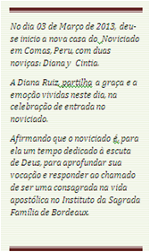 Fue un día para agradecer por todo lo vivido y aprendido dentro de la Sagrada Familia de Burdeos, fue un tiempo para agradecer a Dios por mi vocación, por las hermanas con quienes he vivido y que me han acompañado en este camino, por mi familia que de cierta manera me acercaron a Dios y sobre todo, por darme su gracia para seguir respondiendo con amor y libertad a su llamada dentro de esta familia de Pedro Bienvenido.Este tiempo significa para mí un tiempo de dejar que Dios obre en mi vida, que sea Él quien modele mi corazón según su corazón; un tiempo de creer, de confiar y de abandonarse en aquel que es eternamente fiel; un tiempo para avivar el amor en mi corazón y dejarme llenar de la ternura de Dios, un tiempo de alegría y gozo, un tiempo para saborear el encuentro, un tiempo de disponibilidad, de estar abierta y de acoger; un tiempo de silencio para escuchar la voz de Dios en mi corazón; un tiempo para alimentar mi vocación y cimentar mi vida y lo que quiero vivir.